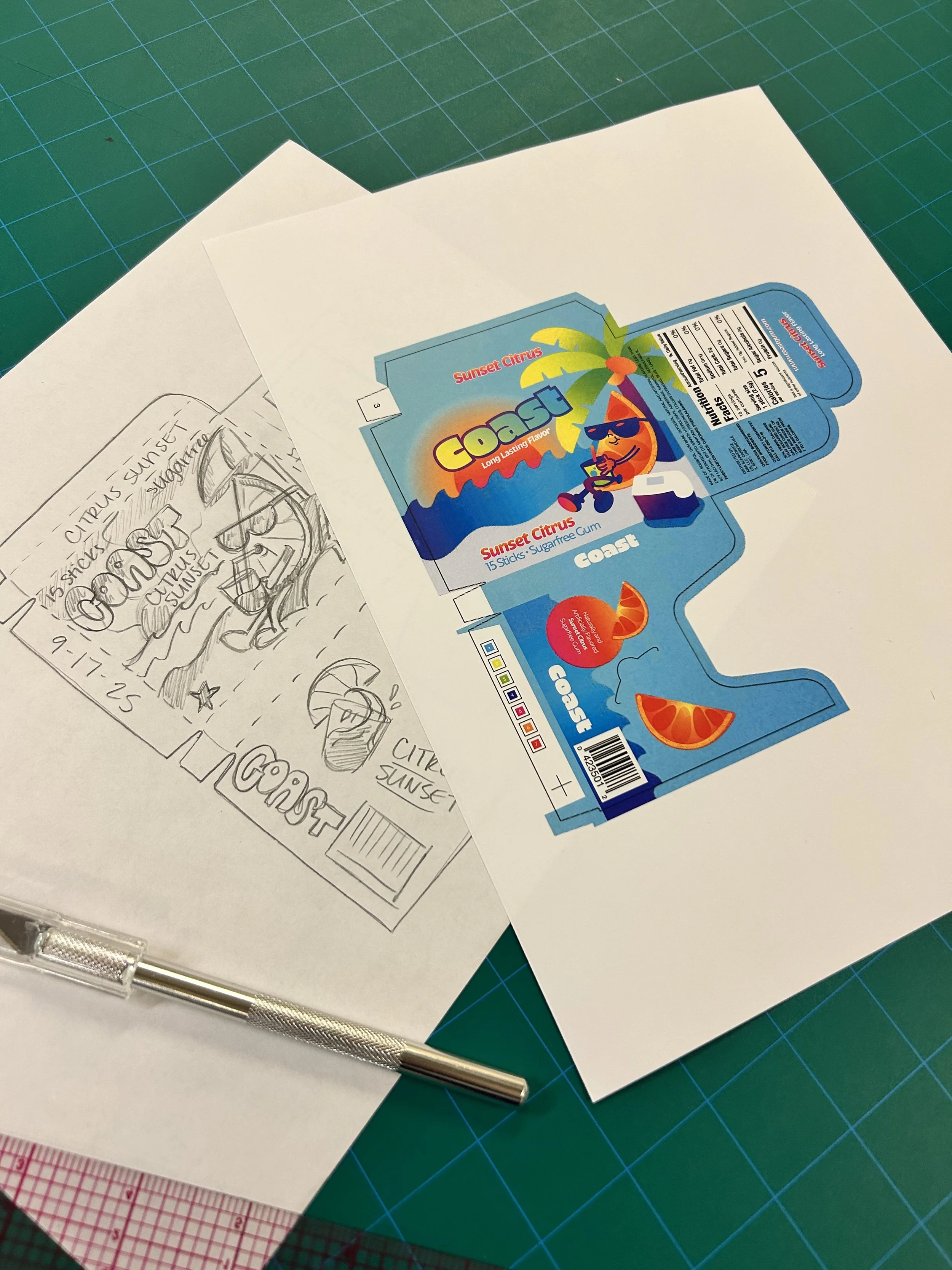 Designed packaging for Coast- a brand of gum that brings the feeling of a beach vacation to you wherever you chew it. This design is meant to stand out against competitors with bright colors and a fun illustration to accompany the unique flavor.